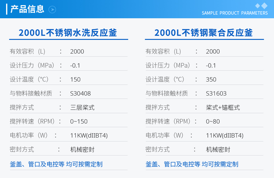 | 主要材料 | 釜體材料主要采用不銹鋼與碳鋼復合材質(zhì) S30408(304)+Q345R、S31603(316L) +Q345R、S32168(321)+Q345R, 也可是純不銹鋼材質(zhì),并可根據(jù)不同介質(zhì)要求制作鈦材、鎳材、鋯材、哈氏合金、蒙耐爾合金等復合材質(zhì)反應(yīng)釜,也可根據(jù)客戶要求主要材料噴涂四氟PTFE/PPL。 | ||||||